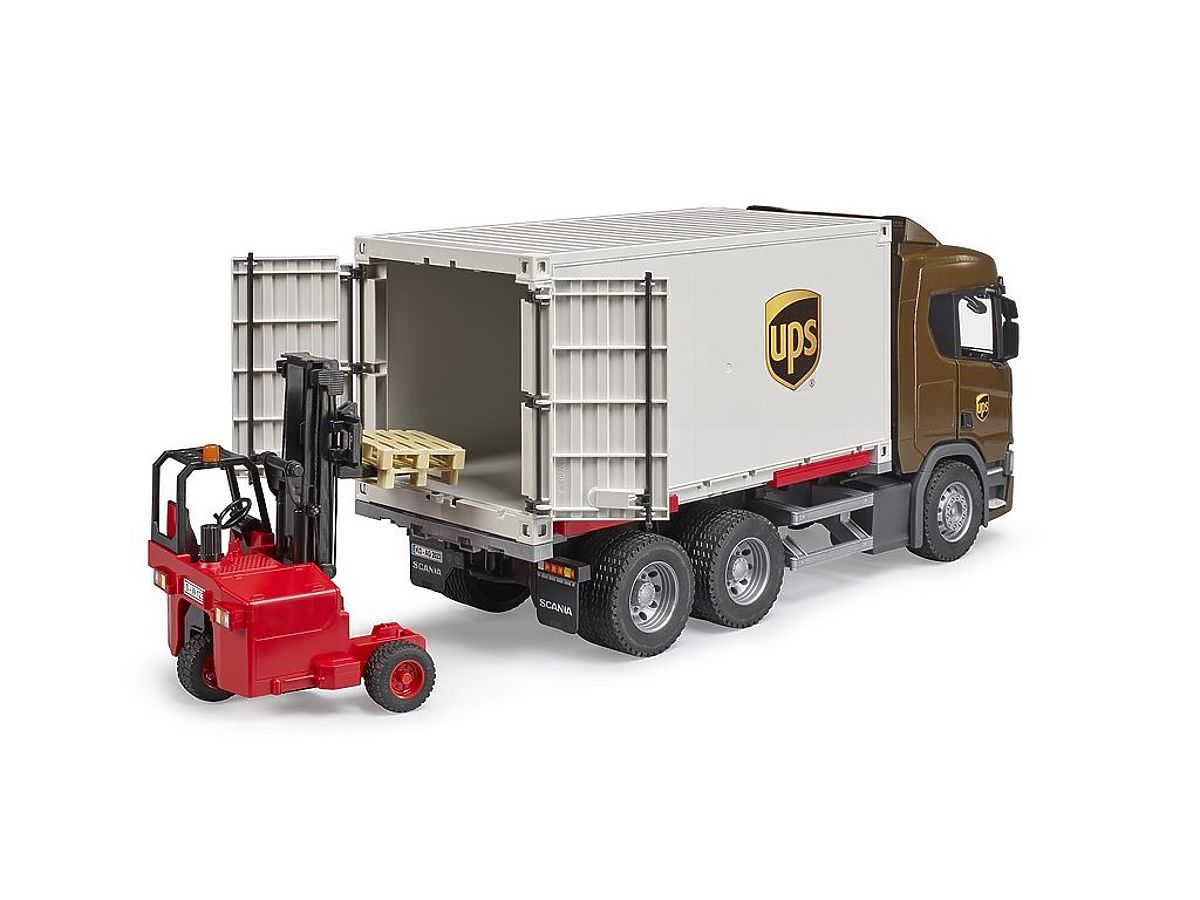 The Scania R series features three axles, opening doors, and foldable mirrors. The package includes a detachable container, two pallets, and a fully functional forklift. The easily disassembled container is equipped with rear swing doors. Support legs facilitate loading and unloading, allowing the container to be easily separated from the vehicle. By extending and retracting the supports, the container is lifted, and the truck can move away from it. For more fun during play, a light and sound module (code BR2801) can be added to the vehicle. Main features: opening doors, foldable mirrors, support legs, detachable container, container rear swing doors, profile tires, made in Germany, suitable from 2 years old