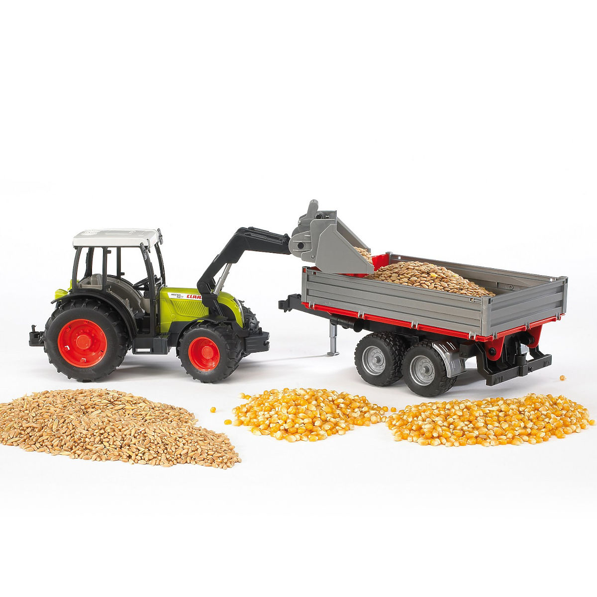 This Class model from the Nectis series with a trailer and front loader is an indispensable helper, especially in the field. Thanks to its sturdy profile tires, the tractor is easily steerable and maneuverable even in more challenging soil conditions. This model is equipped with a fully functional front loader that can be easily removed, has an openable engine compartment, glazed cabin, and functional steering - it includes a second steering wheel with a longer arm that can be inserted into the existing steering wheel in the cabin through a roof sliding opening, greatly facilitating machine control. This set includes a Bruder red tipping trailer, which is a true replica of a two-axle trailer. It has opening side and rear panels and a tiltable loading area. Made in Germany from high-quality materials. Main features: sturdy profile tires, fully functional front loader, openable engine cover, glazed cabin, second steering wheel for easy control, two-axle tipping trailer with side and rear panels and tiltable loading area, made in Germany.