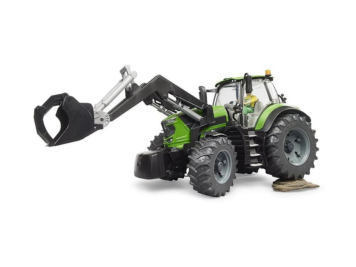 The Deutz-Fahr 8280 TTV tractor with front loader is a reliable and powerful work machine with a perfect combination of technologies for professional farmers. With an impressive output of 287 HP, this tractor can handle any challenge. This 1:16 scale model is true to the original. The driver's cab is fully glazed, and the doors open easily. The opening hood provides a view of the engine. Easy steering is achieved through the built-in oscillating axle and the extended steering wheel, which can be inserted through the roof window. Thanks to the height-adjustable rear hitch, all trailers of the professional series can be used. For even more fun, new removable wheels are attached. All BRUDER agricultural trailers fit this tractor, and it can be expanded with the Mechanic with Tools BR62100. Main features: 1:16 scale, cabin windows made of transparent and unbreakable plastic, opening doors, opening hood, removable wheels, removable front weight, towing device with height-adjustable hitch, holder for front loader, steerable and off-road oscillating front axle, soft plastic tire treads, steerable via steering wheel through the tractor roof window, removable and fully functional front loader, suitable for indoor and outdoor play, made in Germany from high-quality plastics, compatible with BRUDER bworld figures.