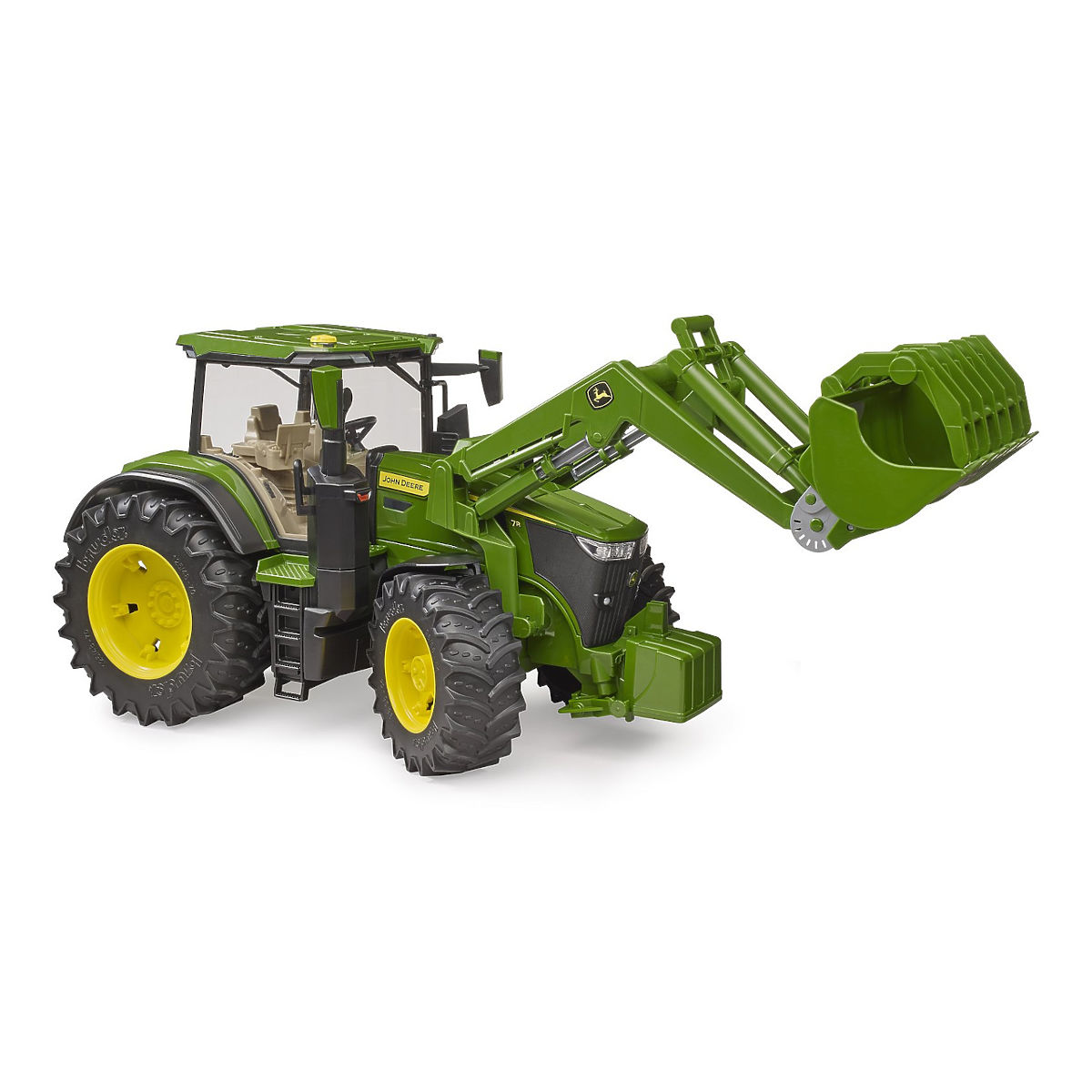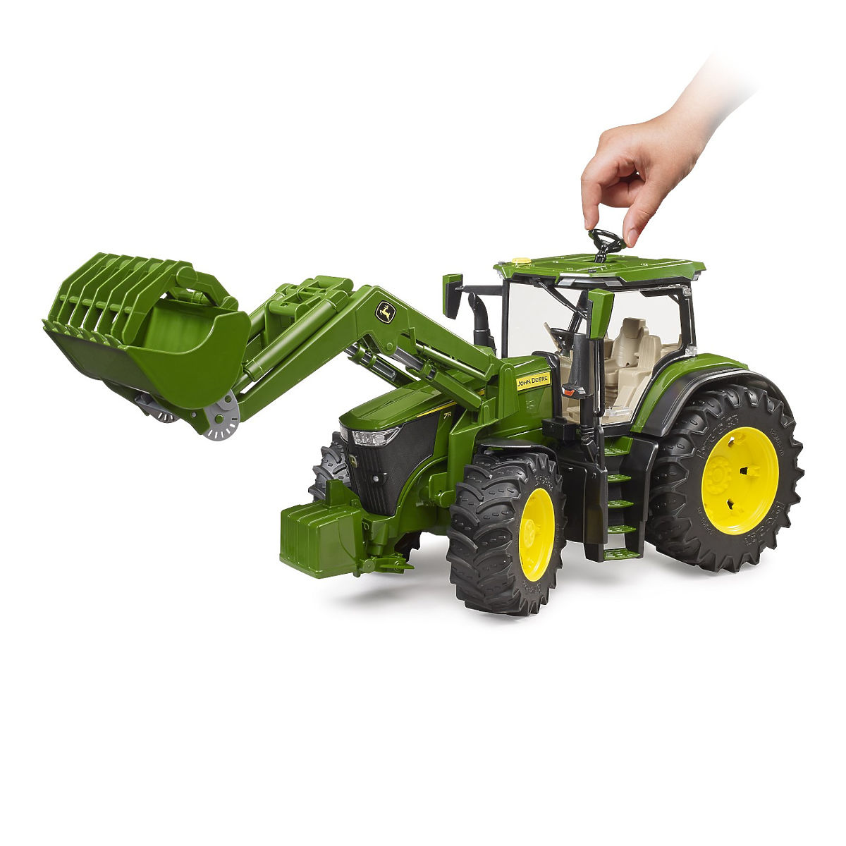 Modern agriculture is now unimaginable without modern tractors. Because the work of farmers is not only complex but also full of challenges, they need the right technology. John Deere 7R series tractors: a combination of low overall weight and high performance. This agile tractor not only speeds up transportation but also advances every farm. This tractor is a new addition to the agricultural theme world. In line with Bruder's motto "Just like the real thing", the tractor is equipped with many realistic details. The hood opens to reveal an impressive engine. The doors can be opened, providing space for optional Bworld figures in the modern cabin. Typical features of the vehicles include excellent maneuverability and driving comfort thanks to the built-in swing axle and steering extension, which can be used through the sliding roof. To increase the fun, the BR03333 front loader can be installed. All trailers of the agricultural series can be mounted on this tractor. You can purchase a lot of additional accessories and Bruder BWORLD add-ons for the Bruder 3150 model to enjoy even more fun. Main features: realistic details, opening doors, opening engine cover, extended steering wheel for easy handling, sliding roof, made in Germany