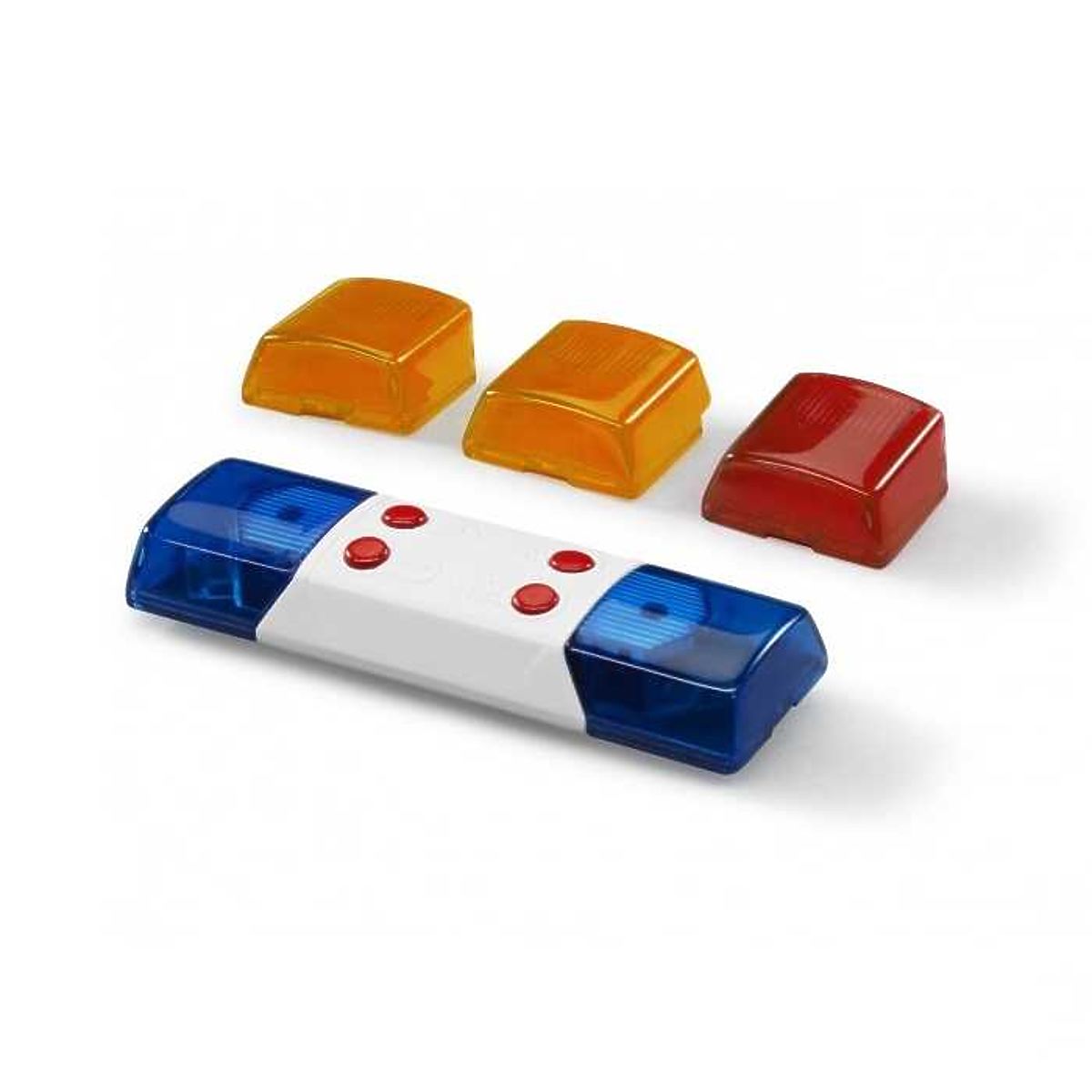 The Bruder universal beacon - the siren has 4 different functions - engine sound, police siren, fire brigade siren, and warning tone. This beacon is installed by inserting it into the roof opening of the cabin and can be replaced at any time. By pressing one of the top buttons, it imitates engine sound, honks, or activates the siren. These 4 functions are activated by pressing small rubber buttons on top of the beacon, and there is also a choice of three color variants of interchangeable covers that can be combined. The module has universal use for both passenger and freight vehicles. Batteries are included. Made in Germany from high-quality materials. Main features: universal beacon with 4 siren tones, made in Germany.