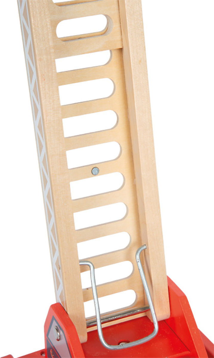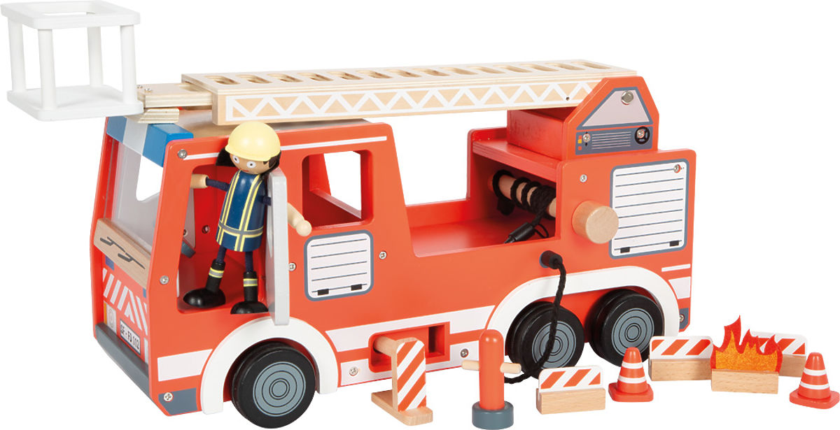 A large fire truck that arrives on the scene in no time! It also stands out with its details and robust construction. The extendable ladder with a basket, which can be rotated 360 degrees, allows for rescue operations at high altitudes and is securely locked in place thanks to a magnet. The extendable support legs provide a stable base, while the retractable hose with a magnetic system and matching hydrant is ready for action-packed firefighting missions. The opening roof provides storage space for a wide range of accessories. The driver's cabin with movable doors also has enough space for the included firefighter figure (a flexible doll with movable arms and legs). Rubberized wheels ensure a quiet and safe journey to the next mission. Whether it's securing accident sites with barrier fences or extinguishing fires with the retractable hose and water sprayer, this playset offers countless possibilities for creative play on the theme of firefighting and rescue. The functional and detailed design ensures an especially authentic gaming experience. Main features: includes 1 fire truck with ladder and hose, 1 flexible figure, 2 traffic warning cones, 3 barriers, 1 extendable stand, 1 hydrant, 1 felt fire ideal for car and firefighter fans sturdy wood, rounded edges realistic design the figure fits in the car movable ladder quiet rubberized wheels