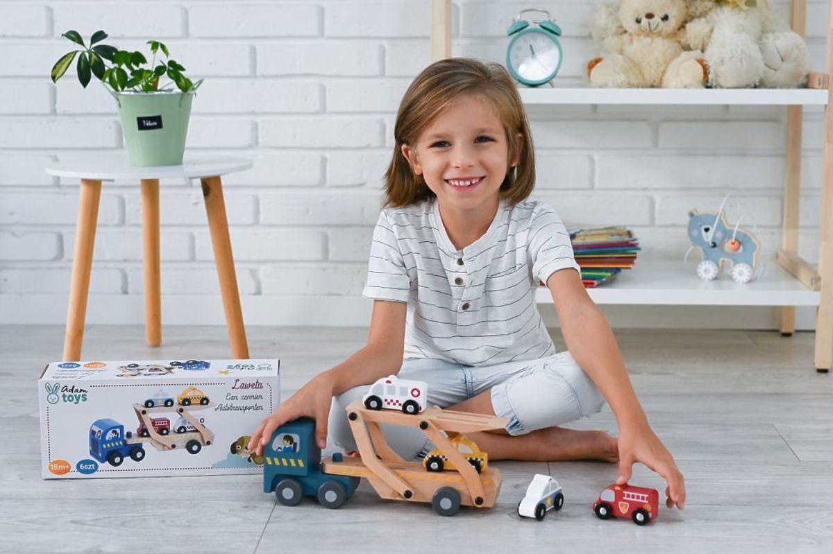The transporter consists of two foldable levels. The upper deck can be lowered to create a ramp for the cars to drive down. The set also includes four wooden, multicolored cars. The transporter is mounted on a peg, making the rear part movable and steerable. The transporter can also be detached to drive only with the truck - the tractor unit. This vehicle offers many play possibilities.