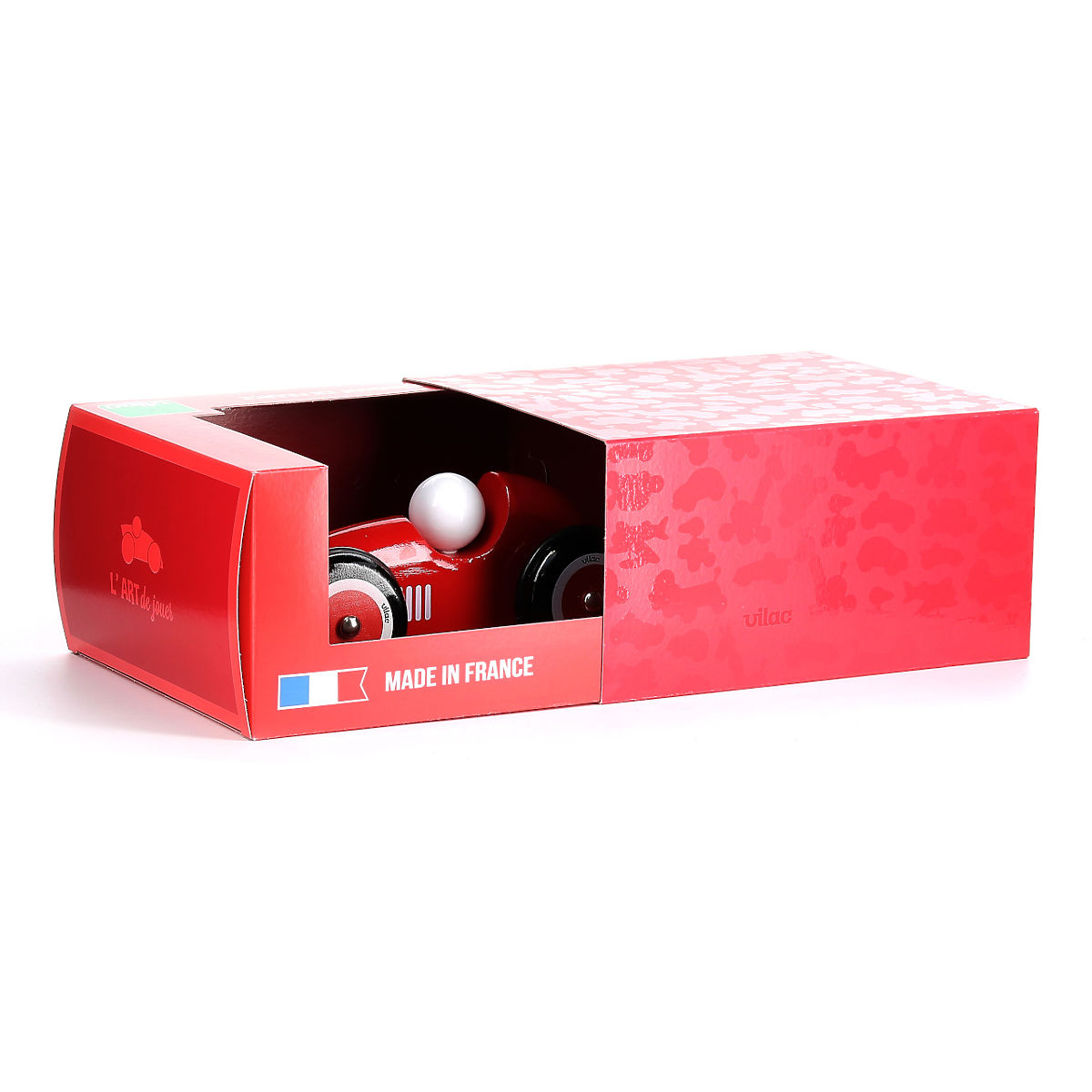 A large wooden car with unique shapes and colors that will excite and inspire both young and old drivers to race. Its design easily appeals to adult collectors and, thanks to its dimensions, it becomes an eye-catching interior accessory. The car parts are made of solid wood, lacquered using the traditional process of dipping in color baths. The robust wheels are characterized by smooth operation and are equipped with rubber rings, ensuring the toy moves quietly. Made in France, delivered in a premium box. Main features: unique design and craftsmanship, quiet and refined operation, made in France.