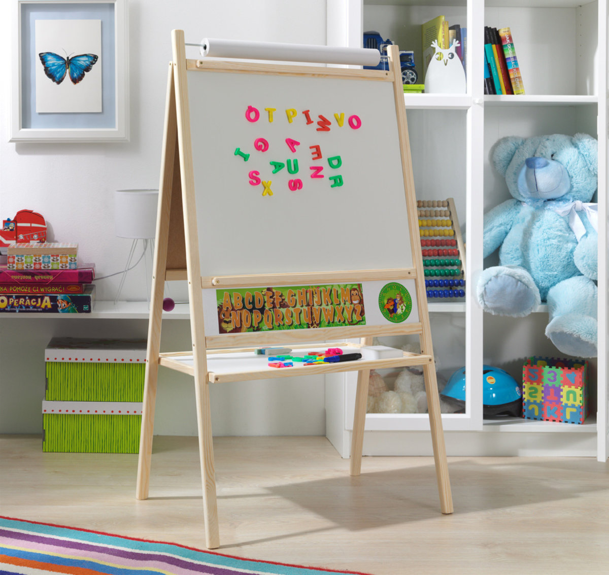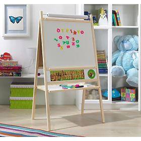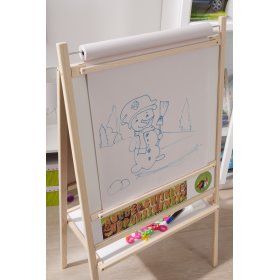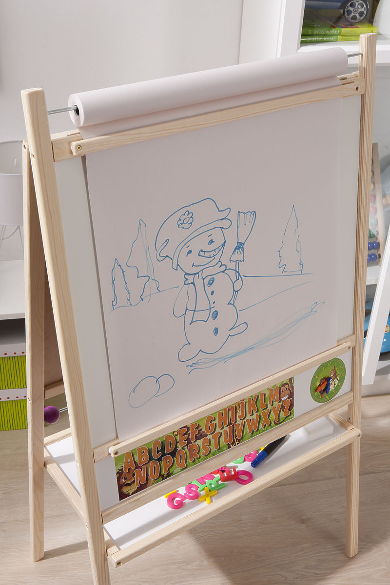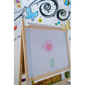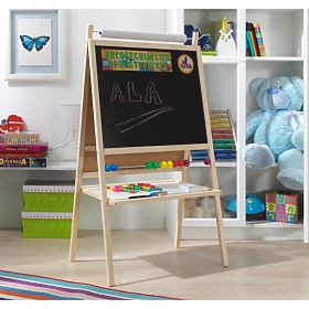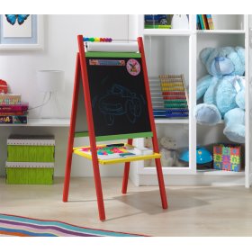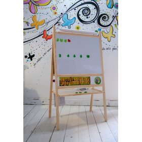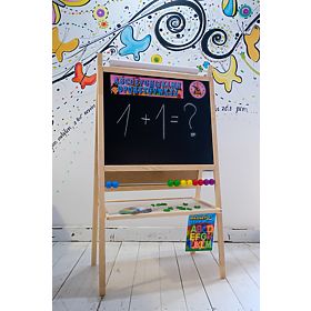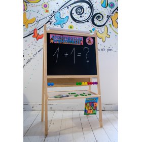 A blackboard with a natural frame is suitable for any children's room. It is not only a perfect child's toy, but also a great tool for teaching and developing a child. By using the 4 in 1 board, you can develop not only writing, counting or reading, but also creative thinking. Under the writing surface you will find a simple colored calculator, a counter for placing chalks and markers.