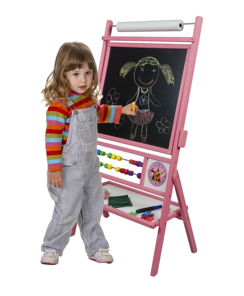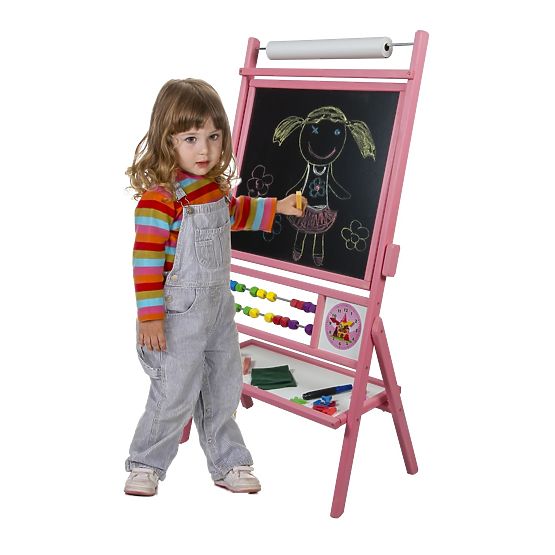 A beautiful children's blackboard in pink color will especially appeal to little girls. The board supports children's creative activity, the possibility of writing with chalk or a marker (on paper or on the magnetic side of the board). It is also a great helper for schoolchildren! Children can make words from magnetic letters, recognize clocks or learn on the counter.