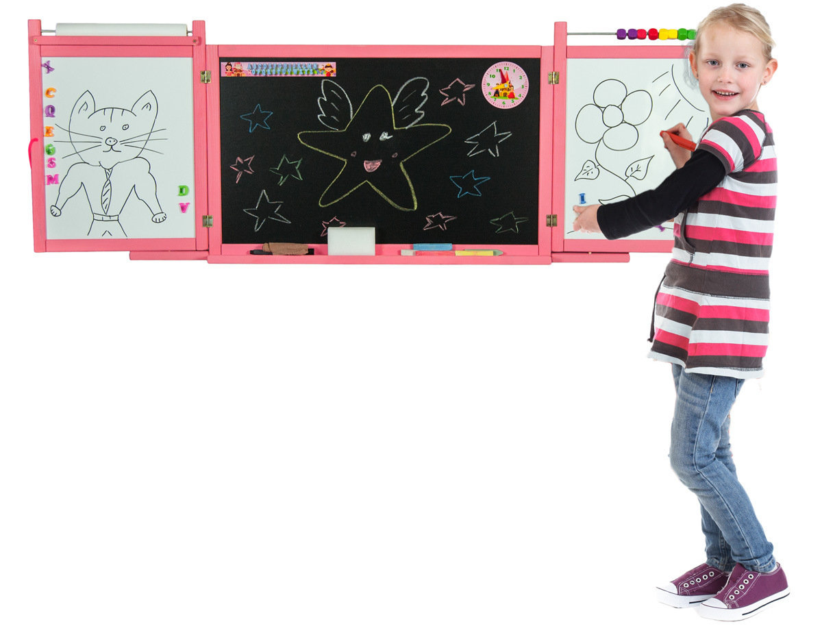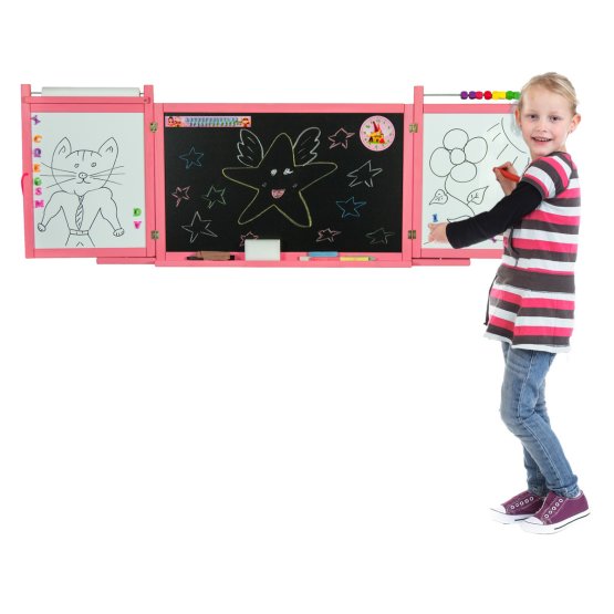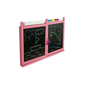 It is made of wood in pink. The board is magnetic on one side and chalk on the other.
