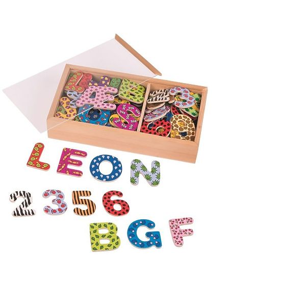 A set of colored numbers and letters that can be attached to a special magnetic board or refrigerator. Numbers and letters are made of quality and durable wood with a magnetic coating on the underside.