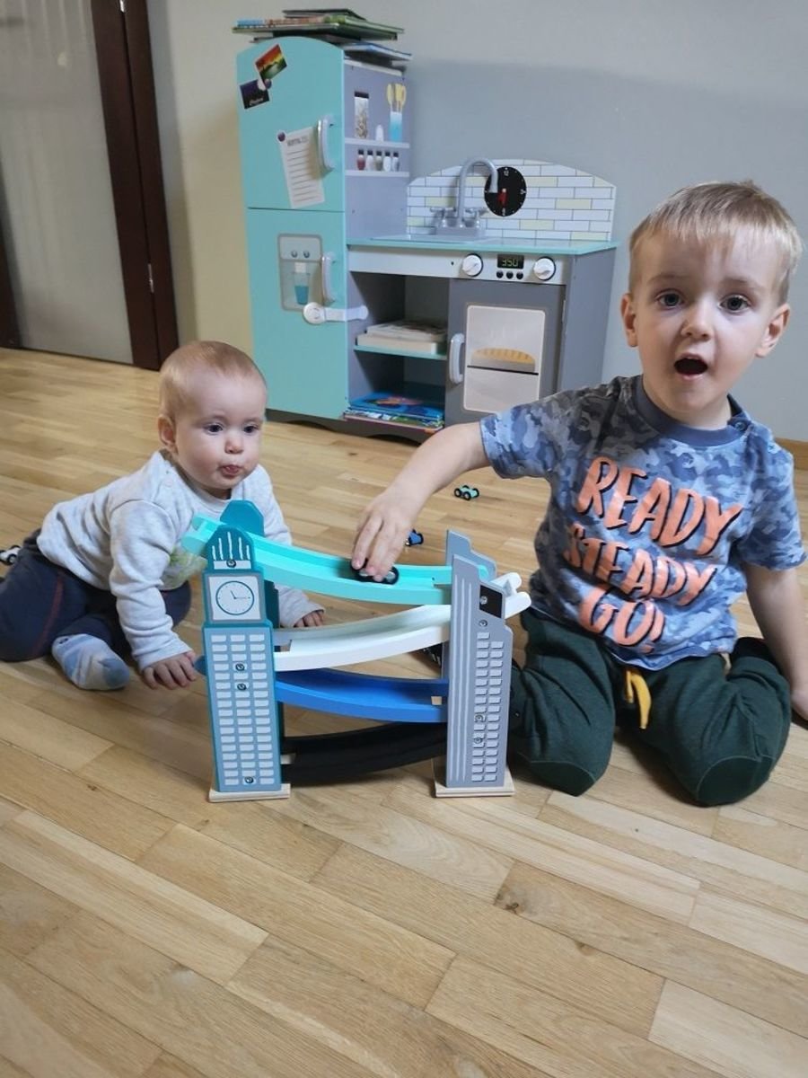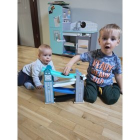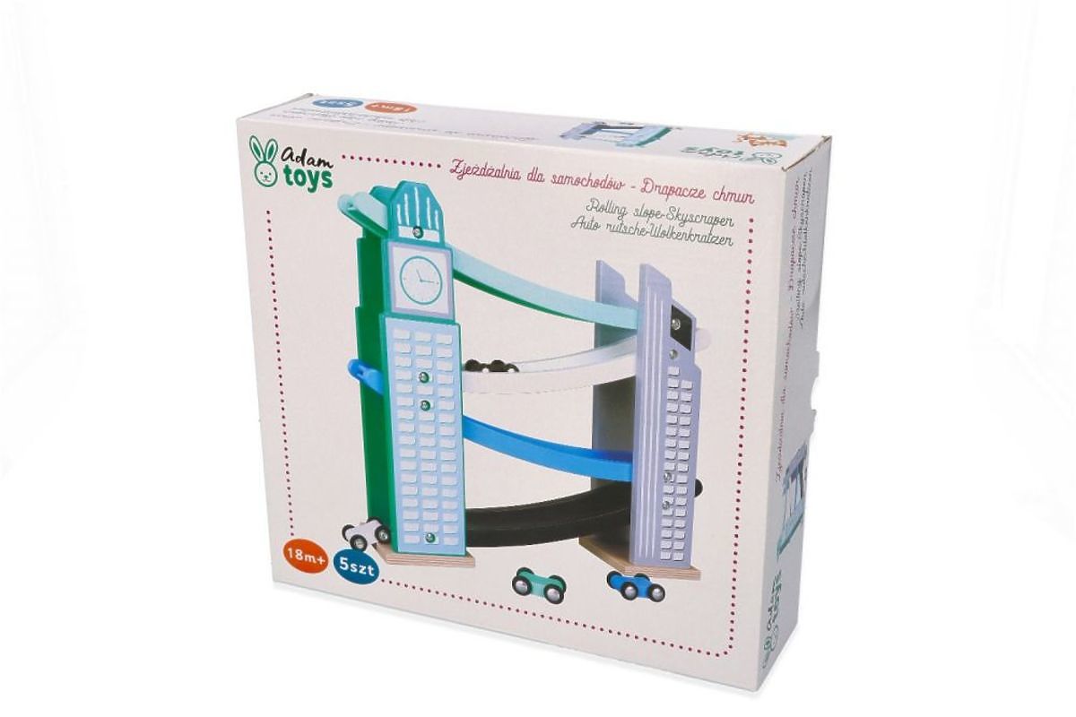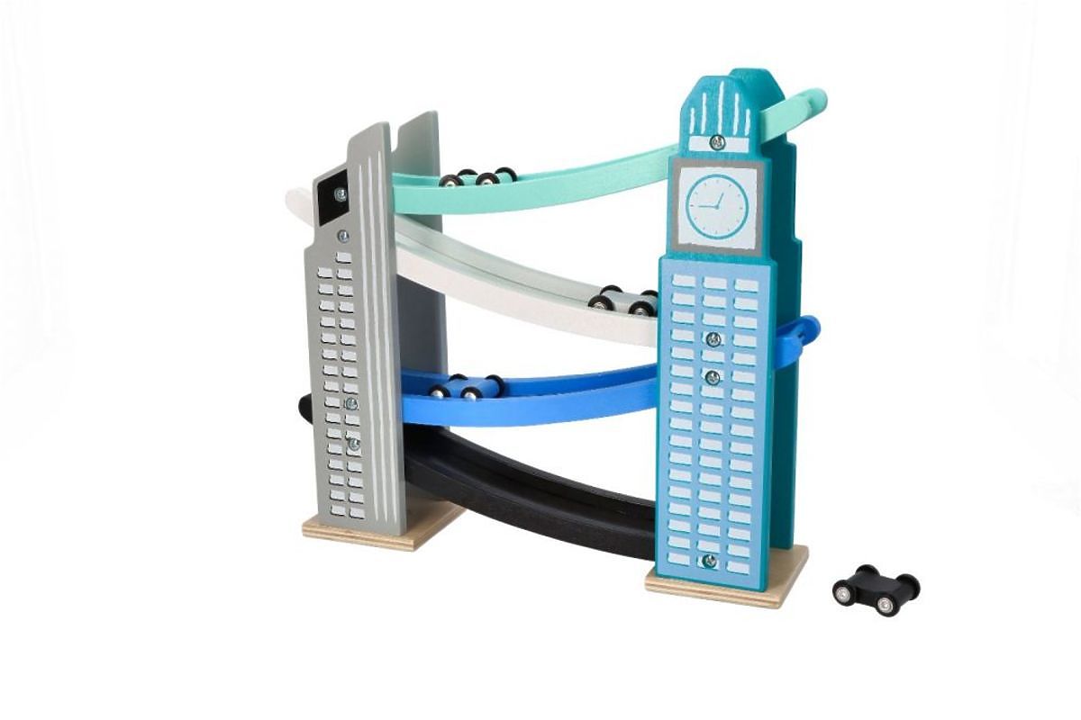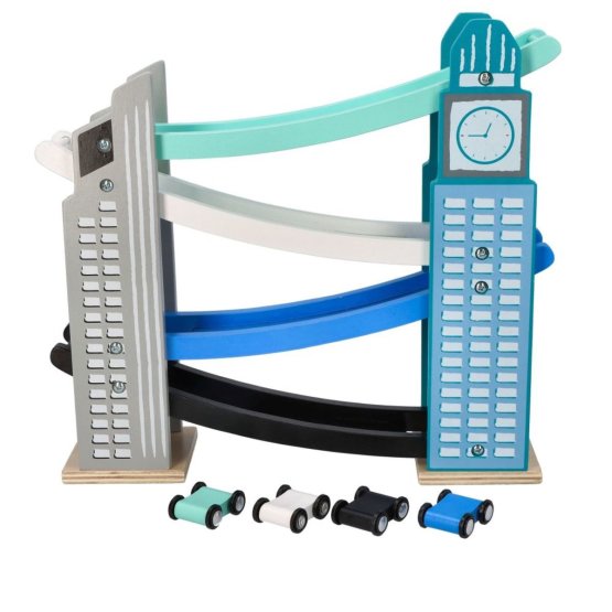 You will have a lot of fun with the wooden slide with the theme of skyscrapers. The toy consists of 4 floors of cascading slides. Place the toy car at the top of the track and watch it go down the individual floors until it reaches the destination.