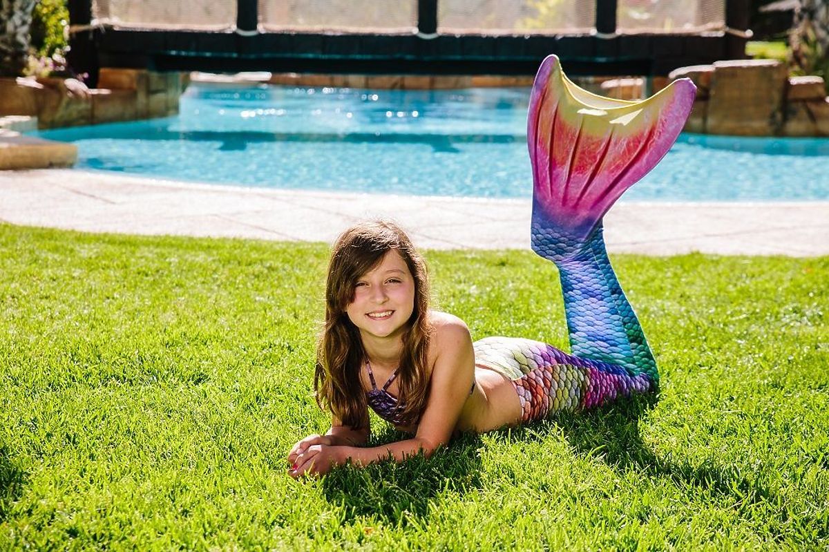 Mermaid tails are available in many colors (also for boys) and in versions with or without a bikini top. The three-piece set includes:
