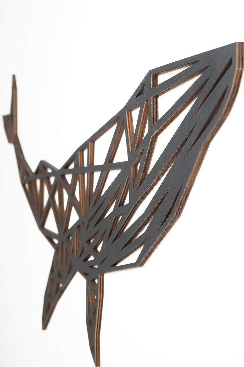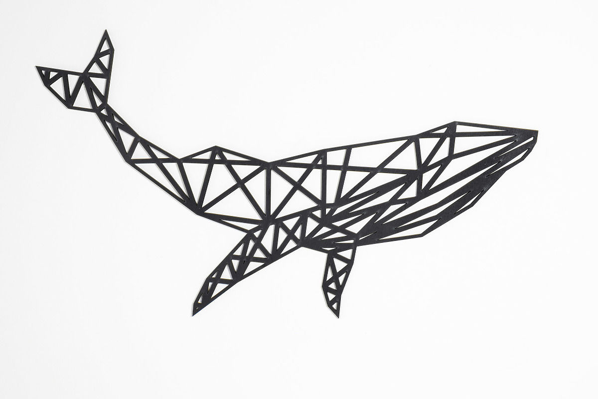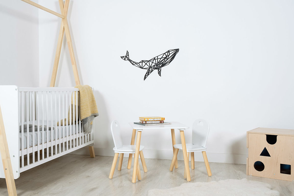 Wooden geometric image in the shape of a whale. Hanging plywood decoration is suitable for a children's room in Scandinavian style.