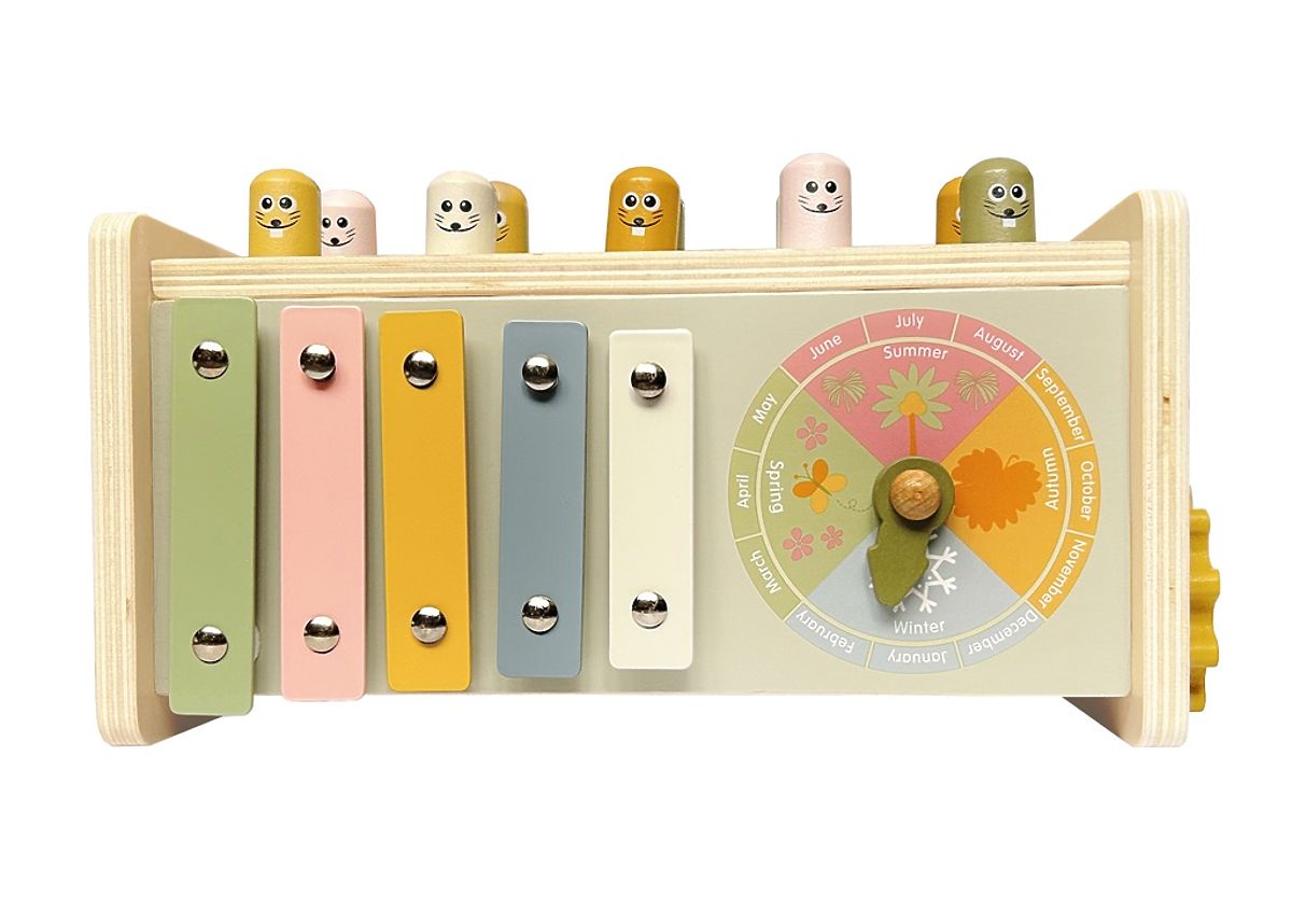 Hammering toy, fishing for little fish, rotating gears and propeller, sliding maze with a chick, clock with hands... And that's not all! This richly equipped multifunctional toy offers children a variety of ways to play while developing important skills. It includes a cheerful hammering toy with moles and a wooden hammer, allowing children to practice the strength and accuracy of their strike. The magnetic fishing rod is used to catch colorful fish, helping to develop patience, coordination, and fine motor skills. There's also a colorful xylophone with a mallet, which enhances musical hearing and sense of rhythm. With many diverse activities, this wooden toy keeps children entertained for a long time and stimulates their curiosity, logical thinking, and sensory perception. Everything is made of high-quality and safe wood in pastel colors with animal motifs. The xylophone is not a musical instrument, it is only a toy. Main features: 8 pieces hammering game, hammer, fishing rod, mallet multifunctional toy stimulates perception, logical thinking, and sensory perception supports fine motor skills and hand-eye coordination suitable for children from 2 years old