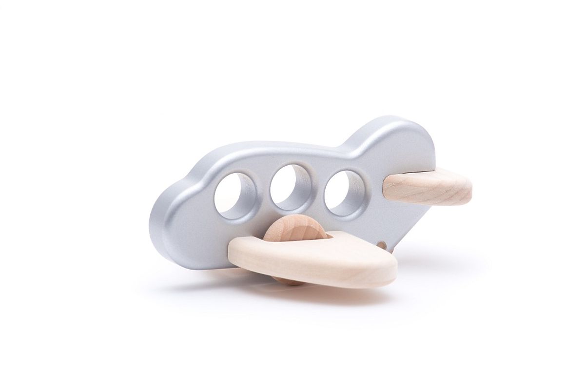 Wooden airplane with three windows, which also serve as a grip for a small hand. The shape, curvature, and appropriately chosen size of the openings allow the child to explore finger grip and recognize shapes. Every movement of the toy, such as pushing, rolling, riding along furniture curves, or drawing lines in the air, helps the child discover space and dynamics hidden in the body. Playing with the airplane thus develops gross motor skills. We recommend cleaning the surface of the toy only with a damp cloth. Please do not expose this toy to high temperatures or high humidity, as the wood may bend and deform under these conditions. It meets all European safety standards. Main features: made from natural resources, easily recyclable, design by Wojciech Bajor, suitable for small hand grip, develops gross motor skills.