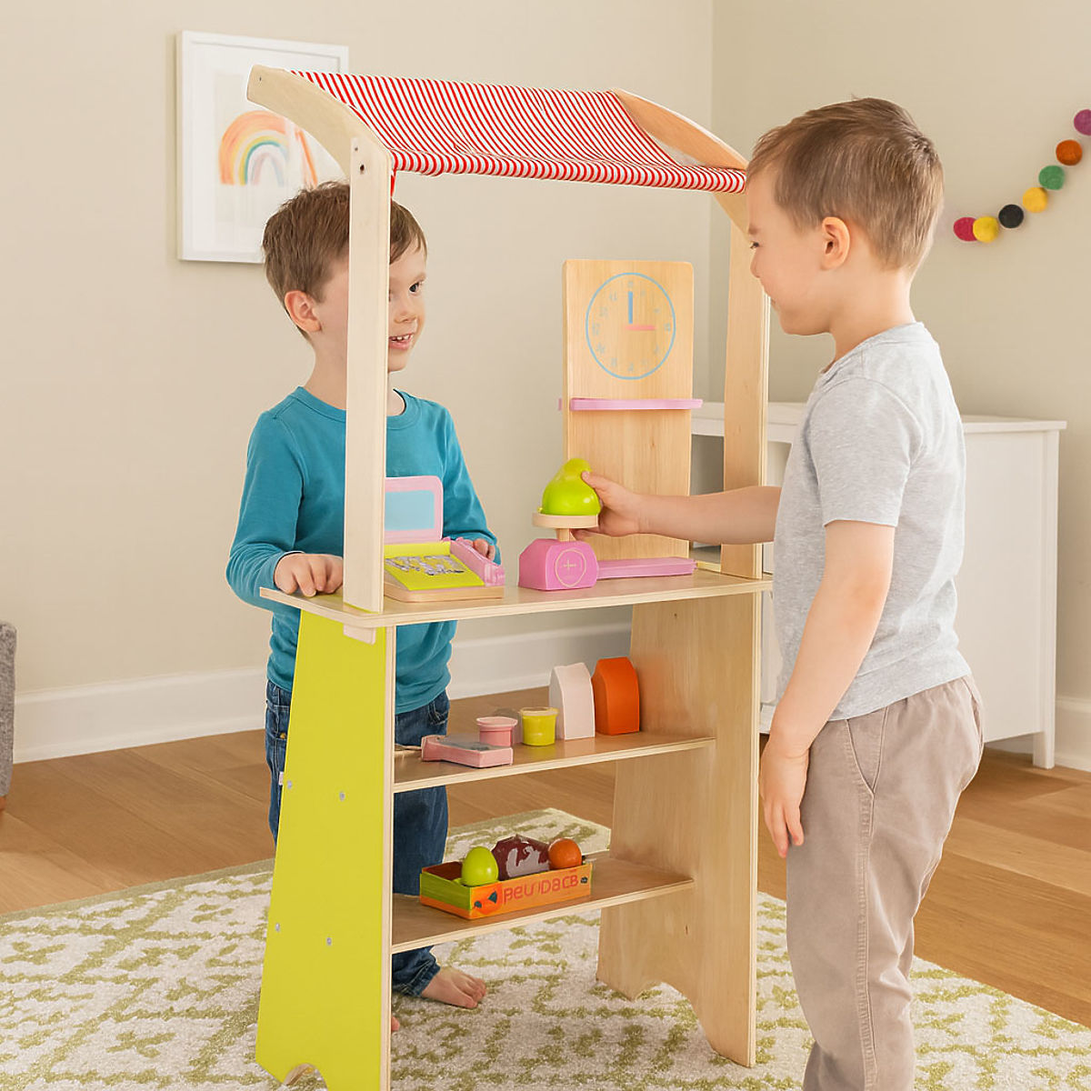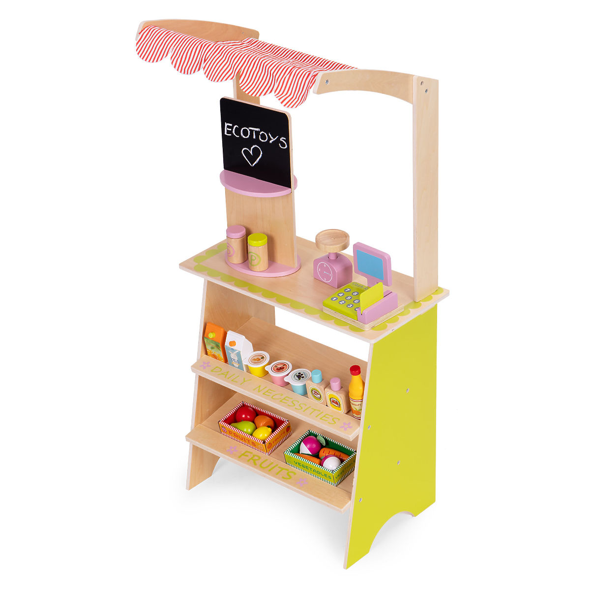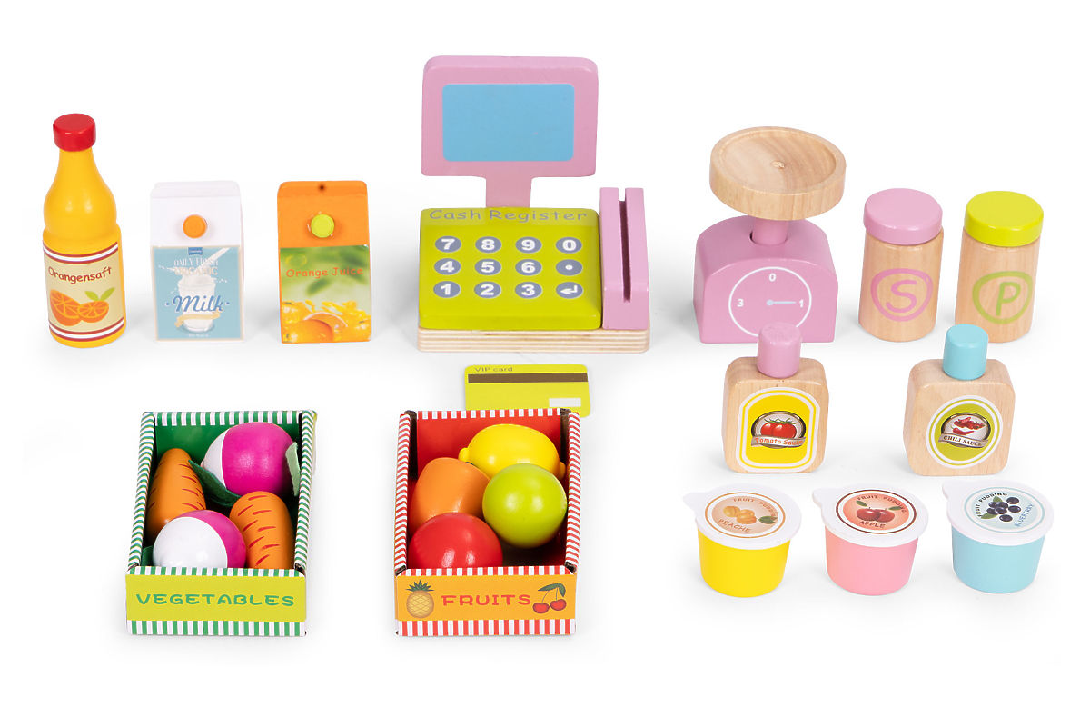 Wooden stand ECOTOYS encourages children to engage in active role-playing, teaching basic social behaviors like shopping, selling, and counting. The toy is ideal for home, kindergarten, or playroom. It's a great tool for learning cooperation, communication, and creative thinking. With the presence of a cash register, terminal, scale, and numerous food products, the play becomes realistic and engaging. The product develops hand-eye coordination, stimulates imagination, and encourages children to act independently.