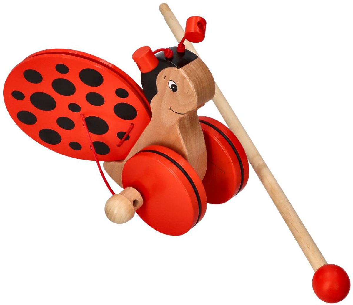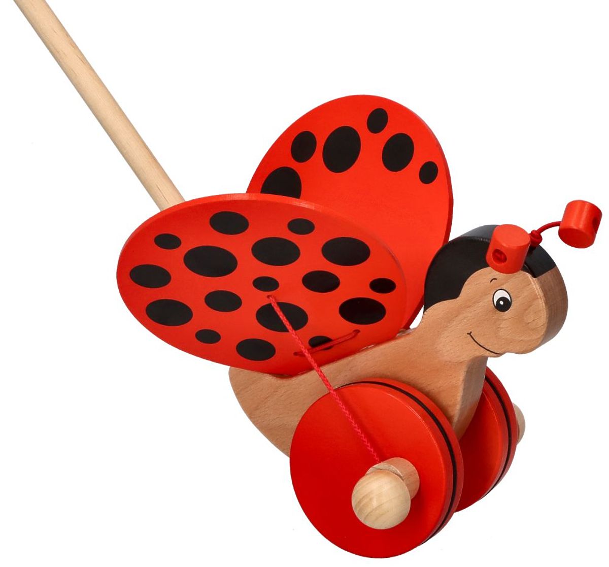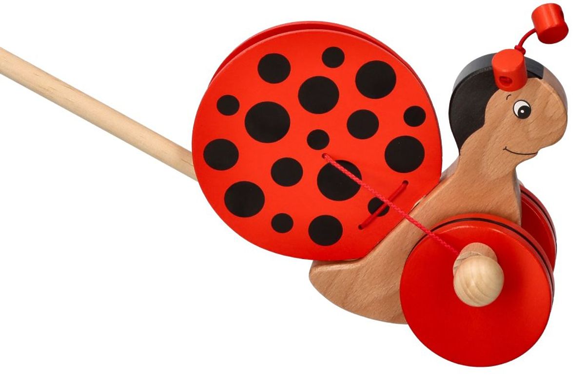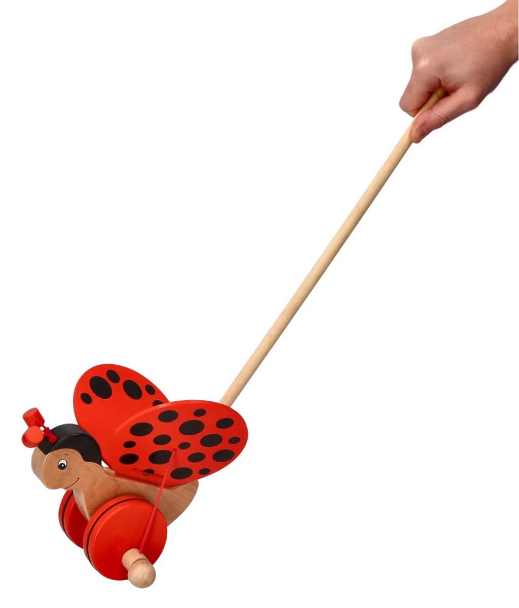 The toy helps the child take the first steps and encourages him to walk. Thanks to the wooden stick, the toddler of his little friend can push in front of him and watch him cheerfully move his wings. The child's attention is drawn to the color red with contrasting black polka dots.