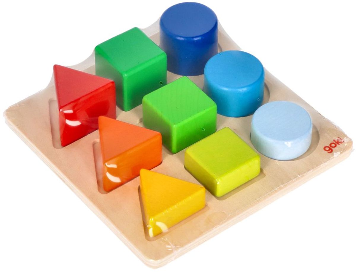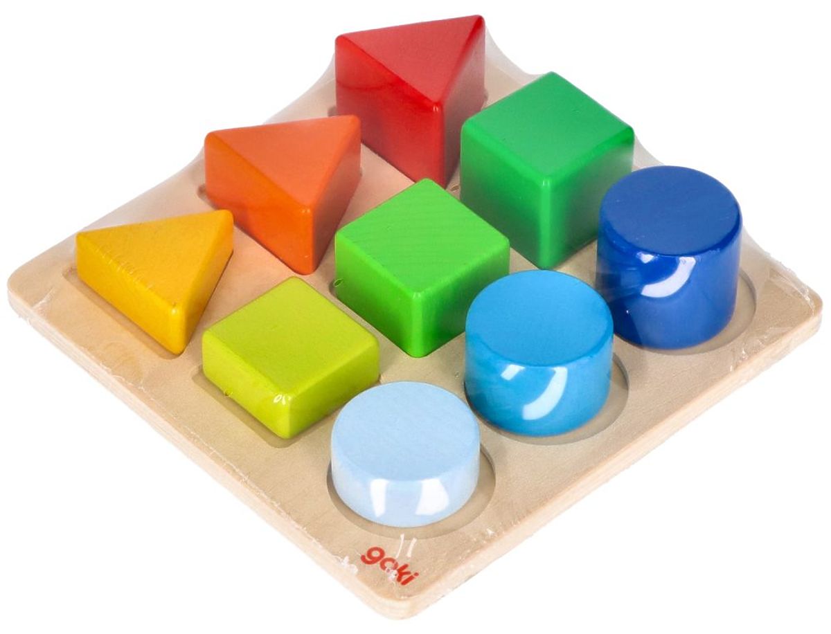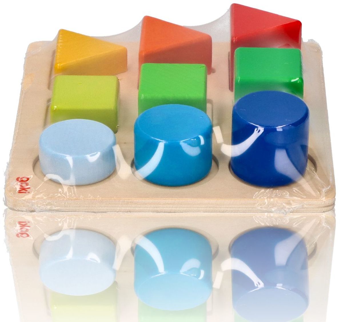 Among the blocks, we find geometric shapes: square, triangle, and circle in three colors. The colors are arranged so that the lowest block is the lightest and the highest is the darkest, which slightly eases the task visually while making it more attractive.