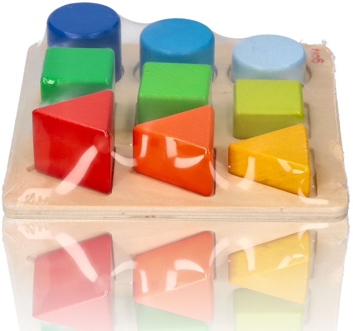 The child's task is to place the colorful shapes in the correct spots on the base. Initially, they can simply match the shape of the block to the prepared recess on the base. The next step is to arrange the blocks from the shortest to the tallest.