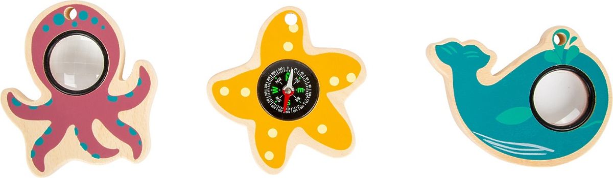 Attention all adventurers and ocean enthusiasts! With these toys, you'll be well-equipped for a sea voyage. The starfish with an integrated compass will show children the way, the whale will help them keep everything "in sight," while the octopus offers a new perspective. The toys – tools have a hole for a string, so children can hang them around their neck or carry them in their pocket.